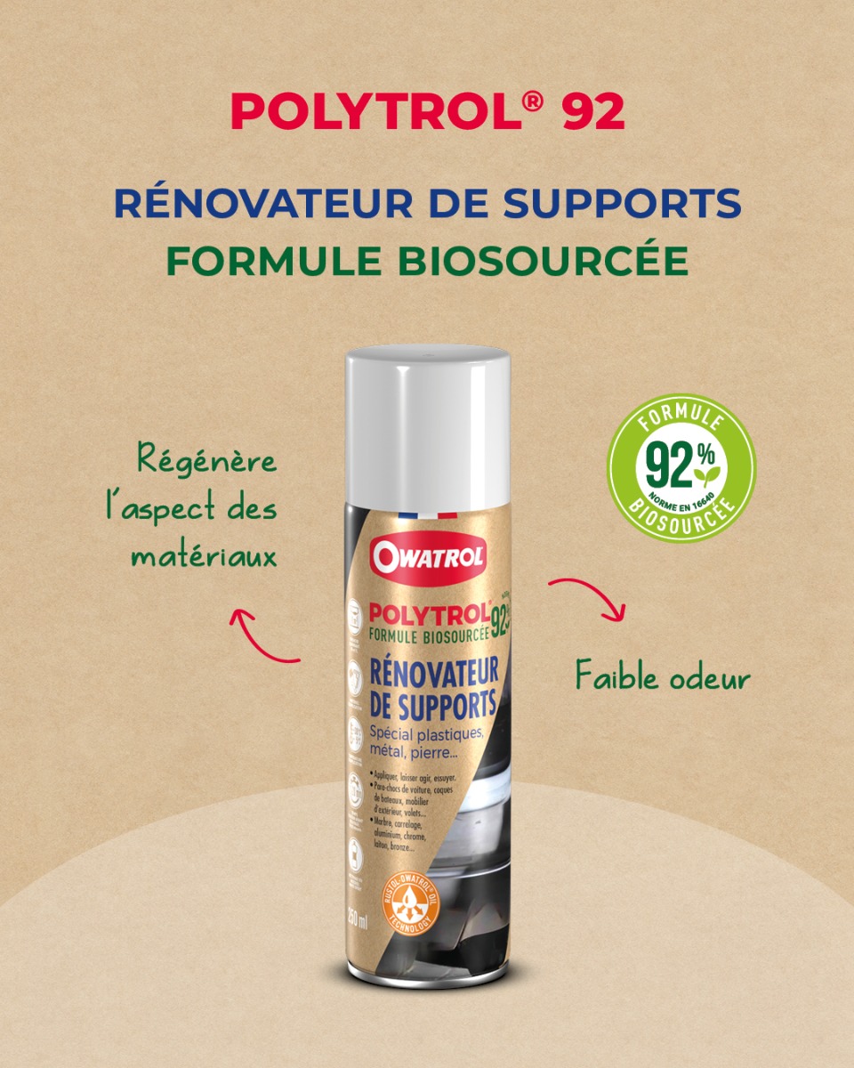 Le Polytrol® 92, avec 92 % de carbone biosourcé, restaure durablement les couleurs des plastiques, métaux peints, pierres et gelcoats. Il pénètre la surface pour raviver l’aspect d’origine, sans film artificiel.