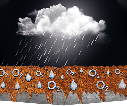 L’oxygène et l’eau provoquent une réaction chimique de certains composants du fer et vont ensemble favoriser le développement en surface d’une couche d’oxyde fer (brun rouge) : la rouille ou oxyde ferrique. Cette réaction lente et progressive appelée corrosion va avec le temps s’infiltrer dans le métal et le ronger petit à petit.